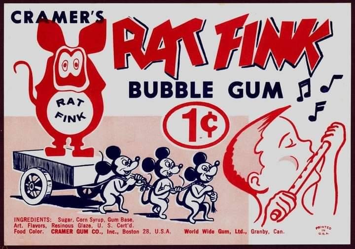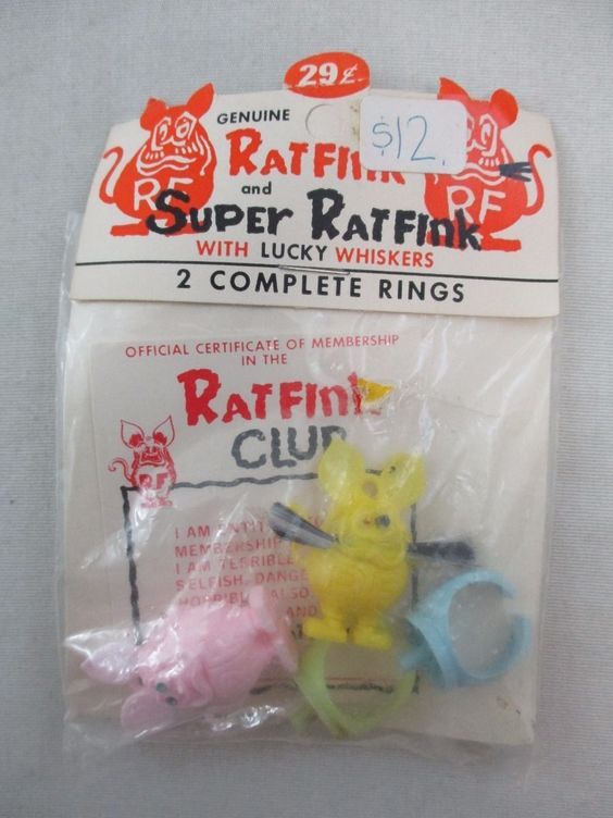 Note also the pointy ears of the ring and vending machine Rat Finks which differ from the rounded ears sported by the iconic Rat Fink which was introduced in the July 1963 issue of Car Craft magazine.