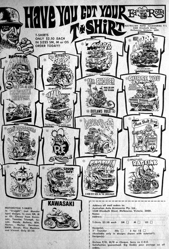 While "Big Daddy" Roth epitomized California hot rod and surf culture in the 1960's, his appeal transcended oceans and hemispheres. Here's an ad for Roth T-shirts that ran in Australia: