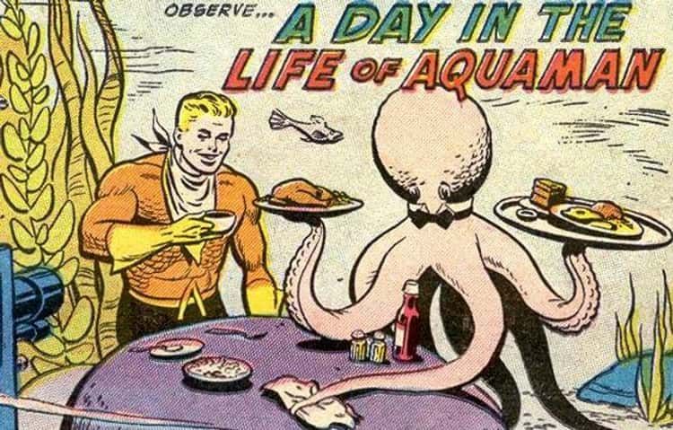 Why oh why is Aquaman slugging that poor octopus? Aquaman is a friend of all sea dwellers! In fact Aquaman has long had a loyal octopus sidekick named Topo: