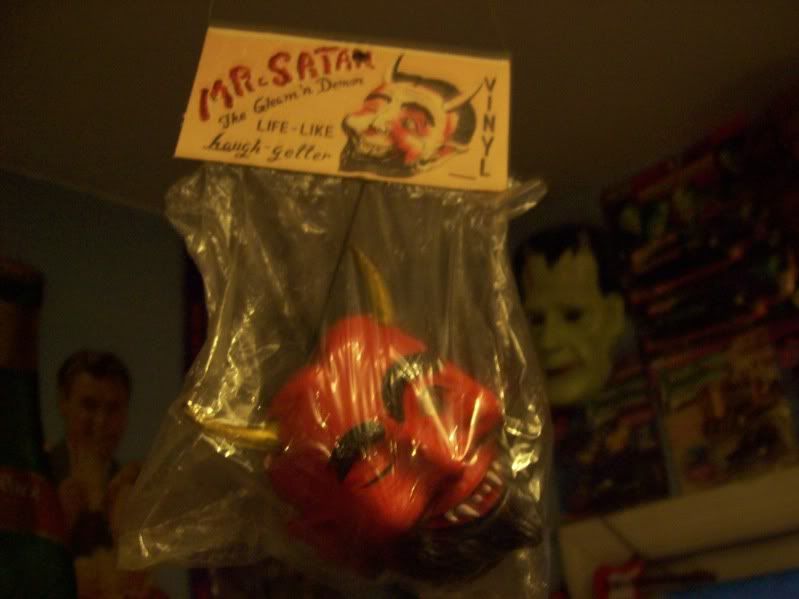 Not "technically" a shrunken head, but equally cool. I've amassed quite a few of these and other similar versions, thanks to ebay. . . But this one's the original. "Mr Satan" is the title on the package header... Hey Monster Bob,  you MUST have one of these dangling from somewhere in your Horton Heat Ford , right?  This head is also associated with the classic Twilight Zone episode with William Shatner. The springy devil head on top of the fortune telling machine.