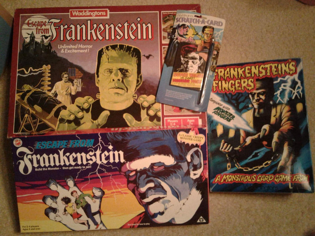 That bottom "Escape From Frankenstein" box's graphics are so much more menacing that the wimpy U.S. version.