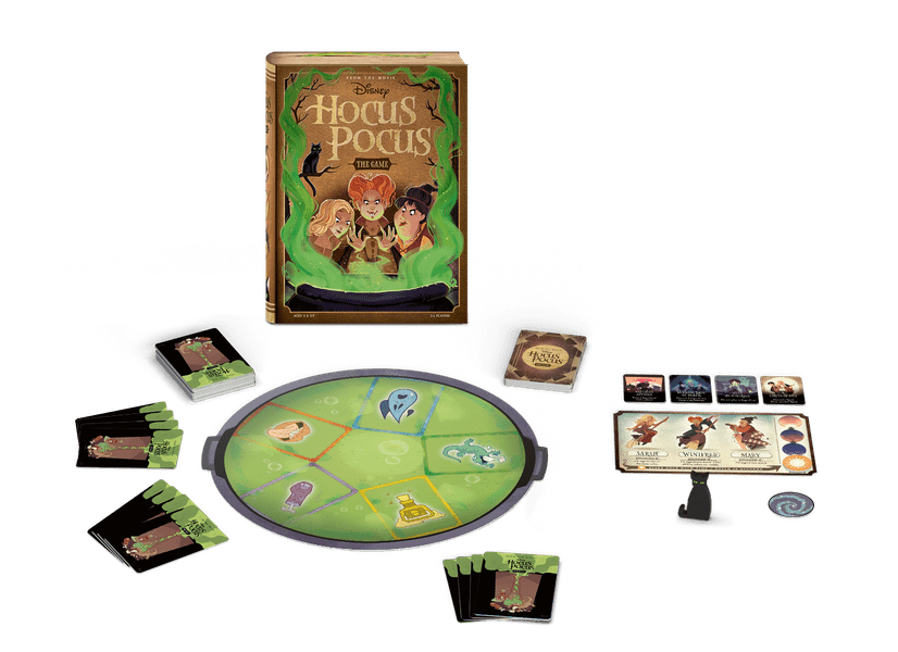 So, this is a cooperative game, the players vs the Sandersons.  There's a cauldron board, a Sanderson Sisters tracking board, 4 trick tiles, a Binx cat token, a spell deck, and an ingredients deck.