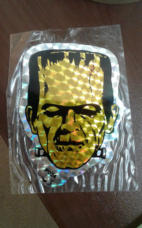 Vintage 80s sticker from Italy.  About 4".    I got it because its the 60s  promo pic for the Don Post Karloff mask.   Just flipped.   Clear stufff is a plastic baggie.