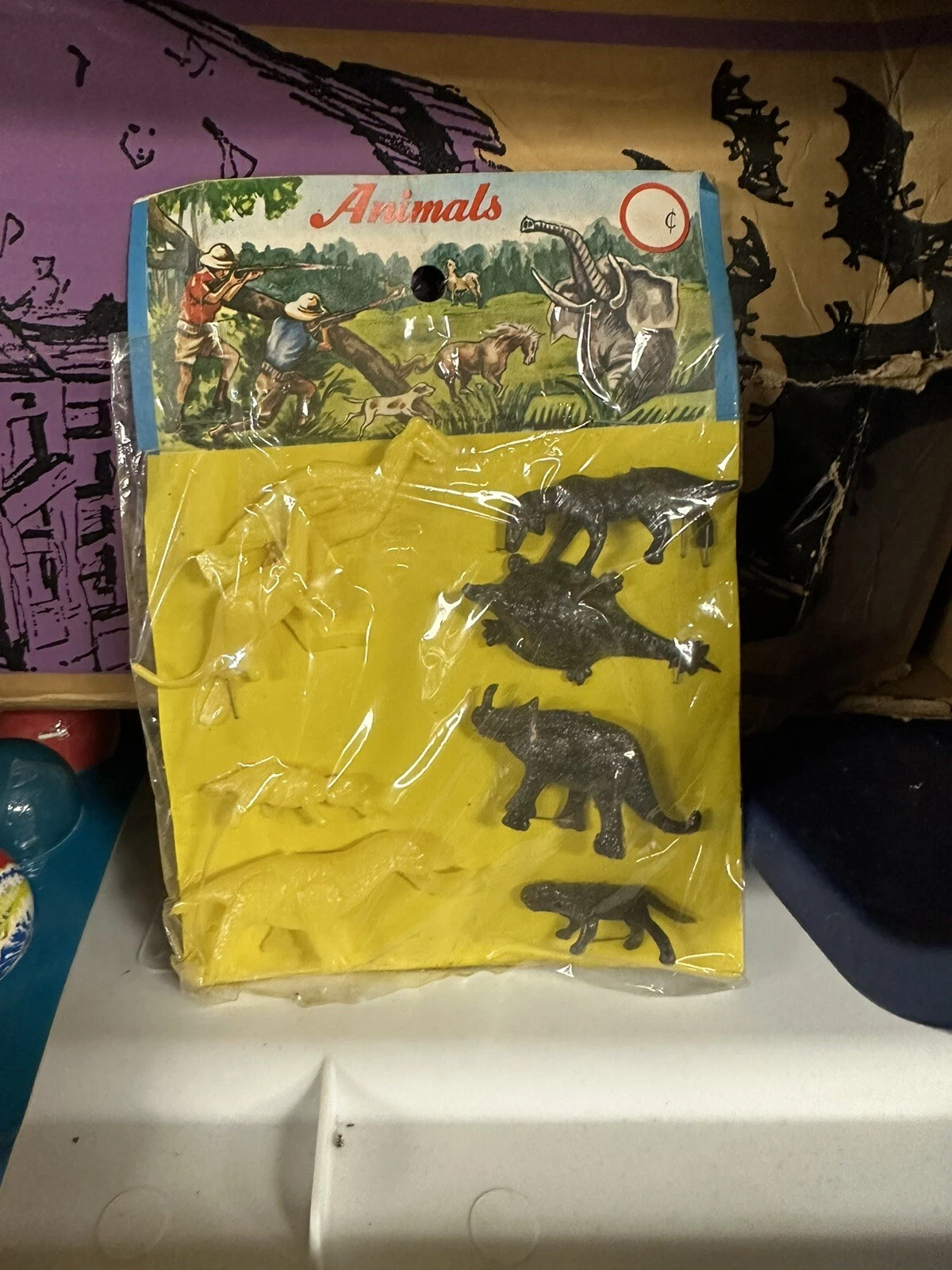 "Made in Hong Kong" is marked on the header card (in the weeds art). No date given but I would guess '70s since there is no barcode. I have a few of these knockoff dino sets in the original packaging, and I pick them up when they're cheap. This one was only $10 with cheap shipping. This is about the crudest example of dino bootlegs I've ever seen. The header card is just marked "Animals" and shows a safari-type scene instead of a prehistoric scene. Interesting oddity for someone into old toy dinos and their packaging.