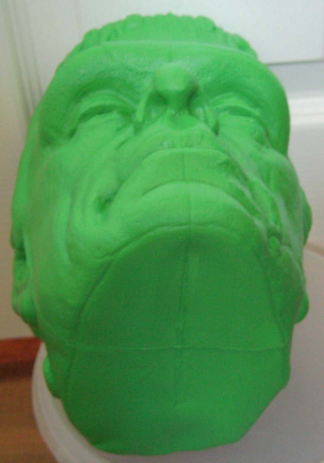 ...   I wonder how he is making these, clearly he has access to a superior mold, with great detailing unlike the recast of the 1980's (itself recast) speaker that popped up fairly recently as well that looked nearly smooth lacking the detail. I wonder just how close these are to the original Clinton bucket, lamp, speaker mold? Obviously these have a second mold line perpendicular to the original but otherwise look exactly like all the photos I have ever seen. I unfortunately don't have an original for comparison but I am more than curious, there appears to be very faint lettering running vertical in the hair on the back in the middle. Are there words here on an original Clinton monster head (bucket/speaker/lamp)? ...