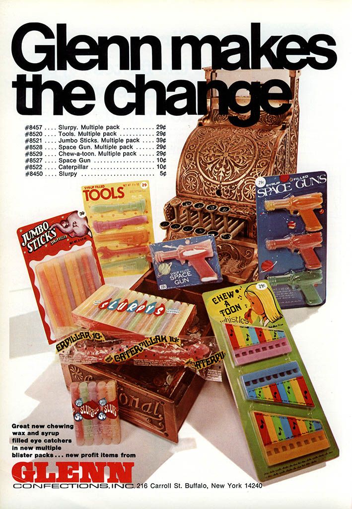 And here's a Glenn sales sheet from 1971 picturing Chew-a-Toon Whistles plus other wild cool confections: