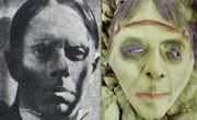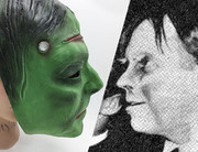 But I understand that the same Zach sculpt or face casting -- the basis of the would-be early 60s mask -- was strangely exhumed in 1977 as a 150-line (3/4 face) Frankenstein mask, of all things, with added scar, electrodes, & some lazily-inscribed wrinkles. (I wouldn't be surprised if they were carved right into the plaster casting.) I bought one on eBay a few years ago, just cuz it seems to be the closest thing to that proposd DP Zach we'll ever have. Can you see the resemblance, below? Geez, they didn't even revise Zach's trademark parted hair!