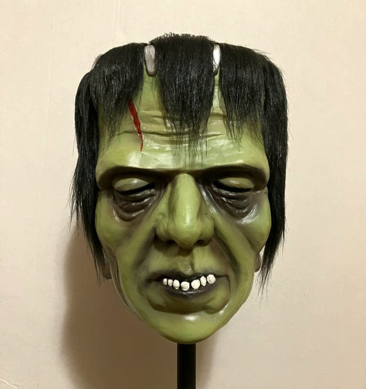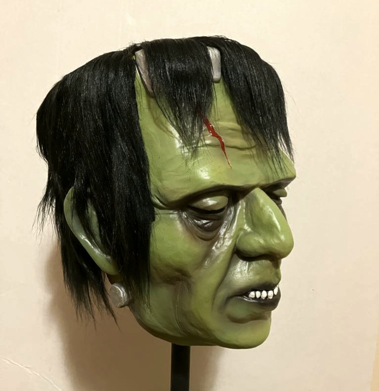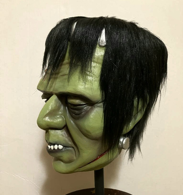 Andrea Sicco's (Siccos horror masks) wonderful tribute/recreation of the Ellis Burman grinning Frankenstein mask sold at Bert Wheeler's Magic on Hollywood Blvd in the early 60's.  The Burmans were a bit crude and not  quite as refined as the Don Post masks they preceded.  Only one crumbling copy still exists and no molds have ever surfaced.   It made an appearance in the skin flick "House on Bare Mountain"
