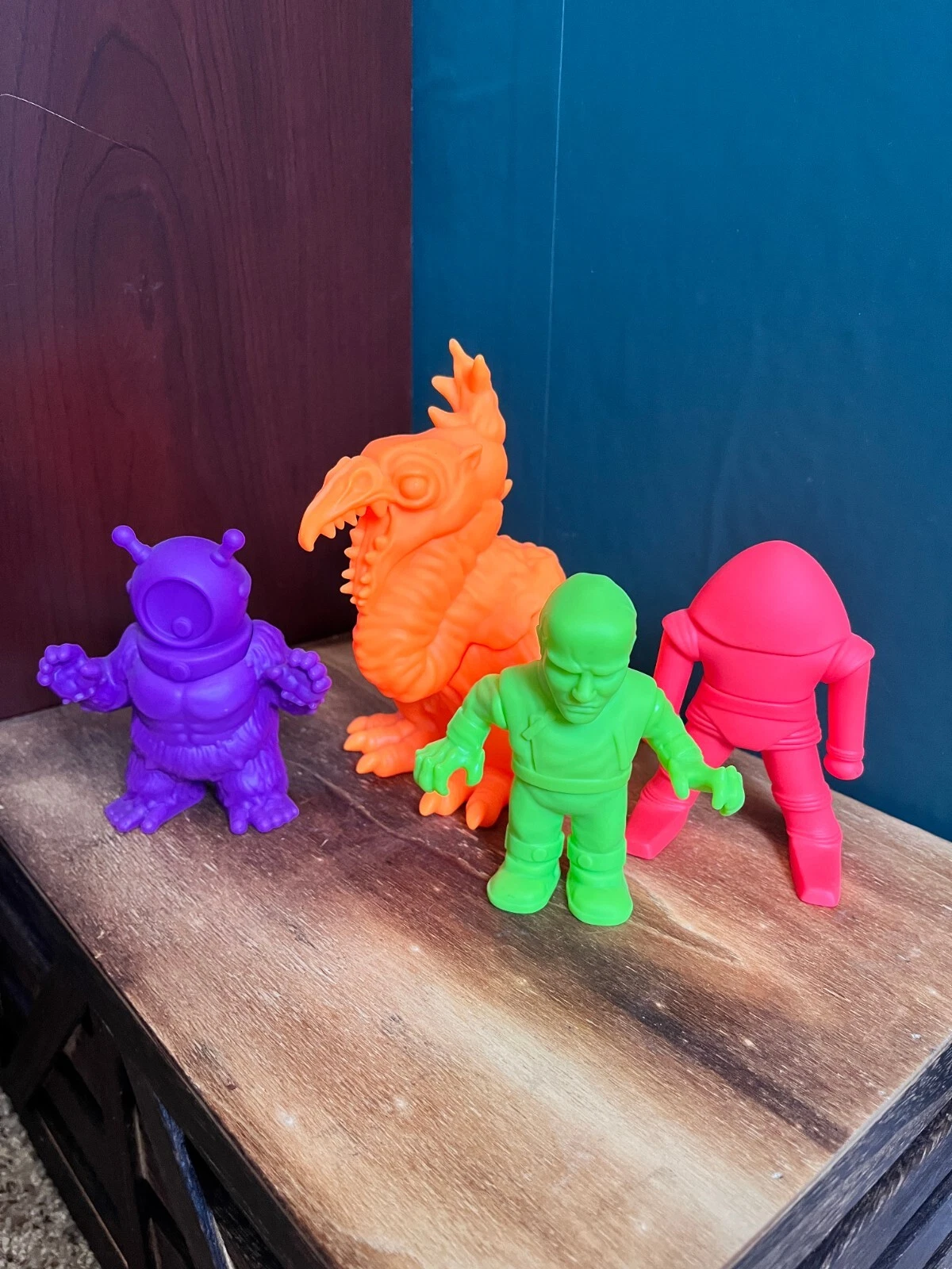 H.O.P. "Mis-Fits" vinyl solid color figures of 50's B movie monsters. Earth vs. Flying Saucers, The Thing From Another World, Robot Monster and The Giant Claw. Each about 4 inches, Giant Claw is relatively taller at 6 inches. Comes from smoke free home.