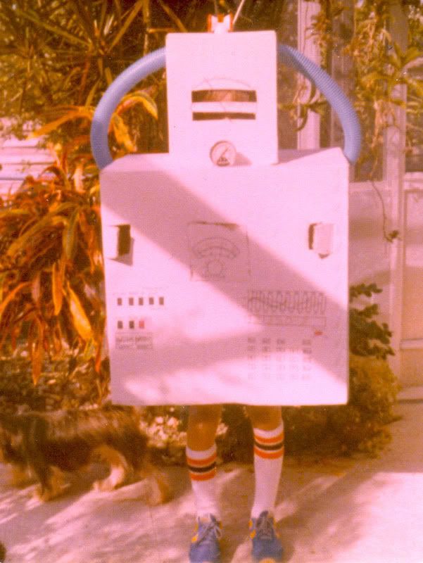 Since we've all been posting old photos I came across this one of me as a robot. This was when we lived in Miami, Florida either 1976 or '77. The thing that I really liked about this costume was that the panel on the front of the box would open up and I had stapled a bag around the inside so that candy could just be thrown inside. I didn't have to carry around a bag.